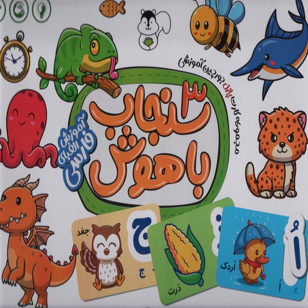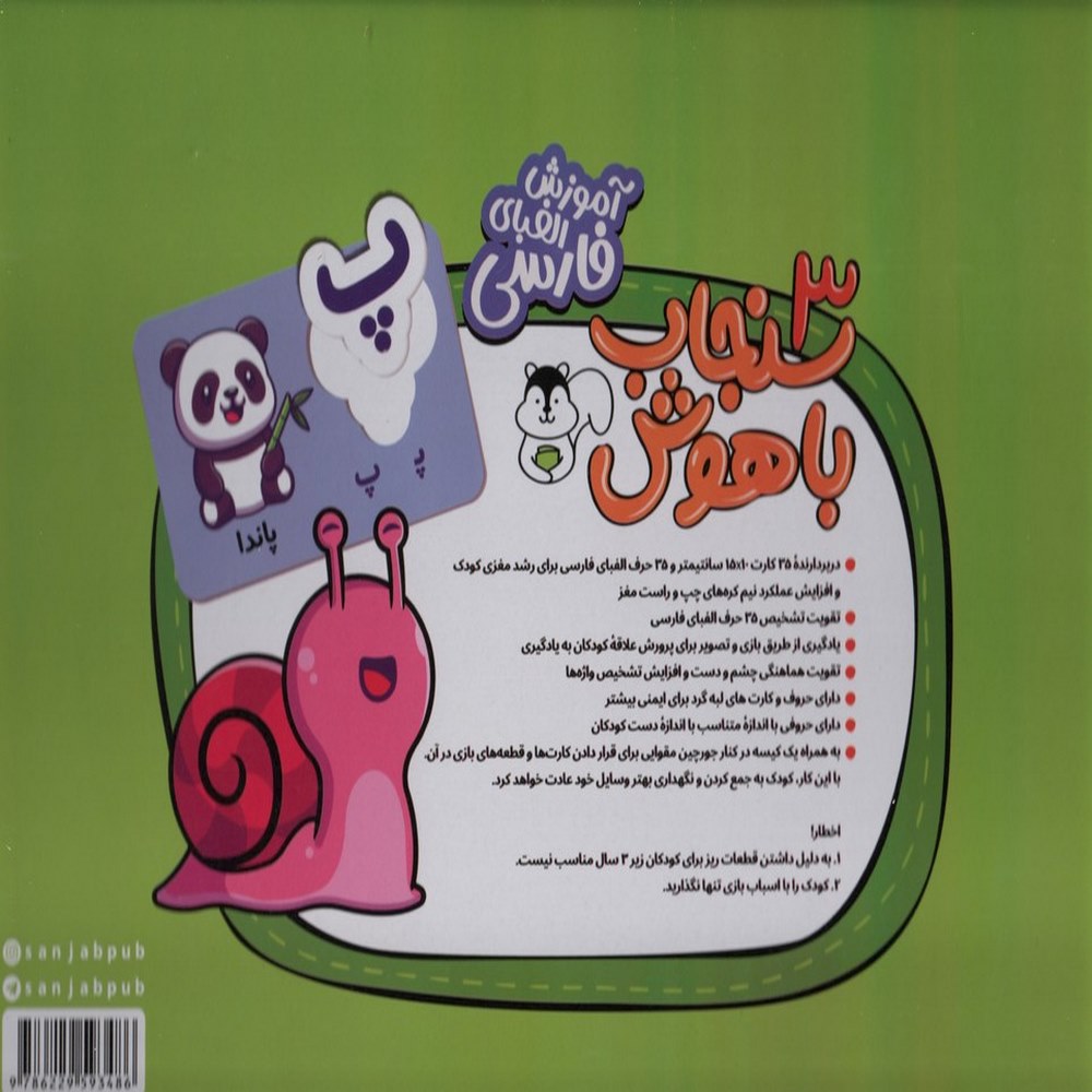 دربردارندۀ ۳۵ کارت ۱۰×۱۵ سانتیمتر و ۳۵ حرف الفبای فارسی برای رشد مغزی کودک و افزایش عملکرد نیم کرههای چپ و راست مغز